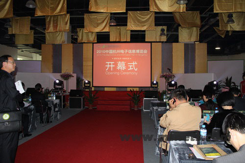 29日下午,2010中國杭州電子信息博覽會開幕式在海報機器人熱舞表演中隆重揭開,省委常委、市委書記黃坤明為本屆展會發來賀信。國家工業和信息化部總經濟師周子學,商務部外貿發展事務局副局長賈國勇,國家金卡工程協調領導小組辦公室主任張琪,副市長佟桂莉,省、市有關部門以及中國臺灣區電機電子工業同業公會負責人一起出席了開幕式。明通科技等眾多杭州知名電子商務企業受邀參加了開幕式,共同見證電子信息博覽會的精彩一刻。